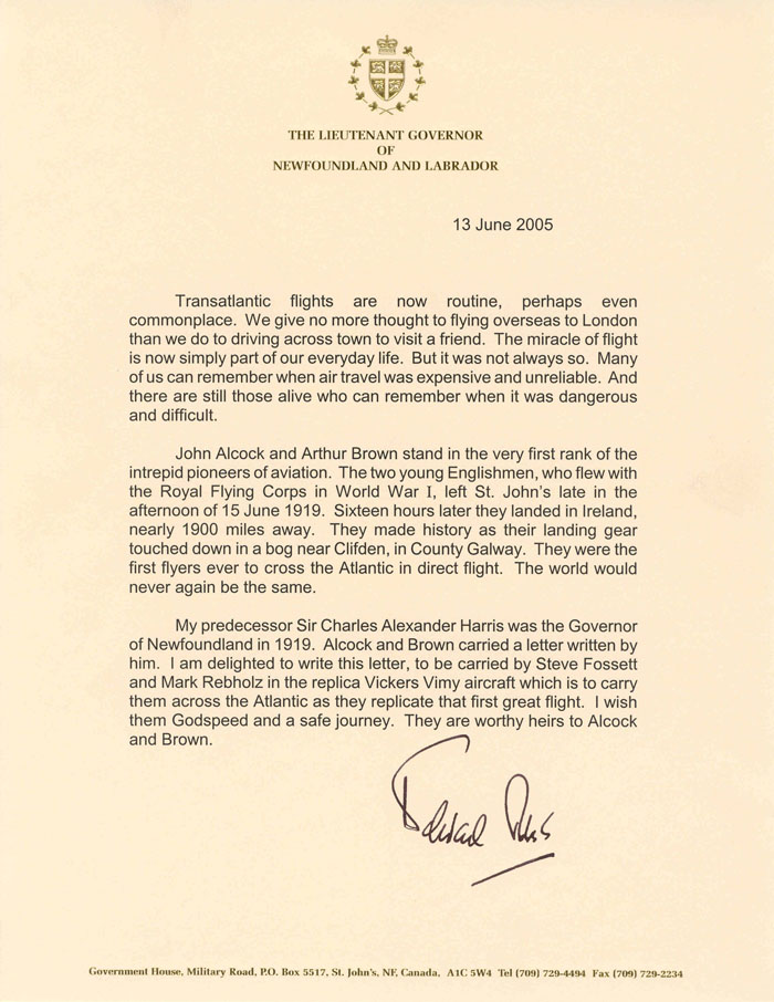 June 13, 2005 Letter of best wishes from The Honourable Edward M. Roberts, Lieutenant Governor of Newfoundland and Labrador.